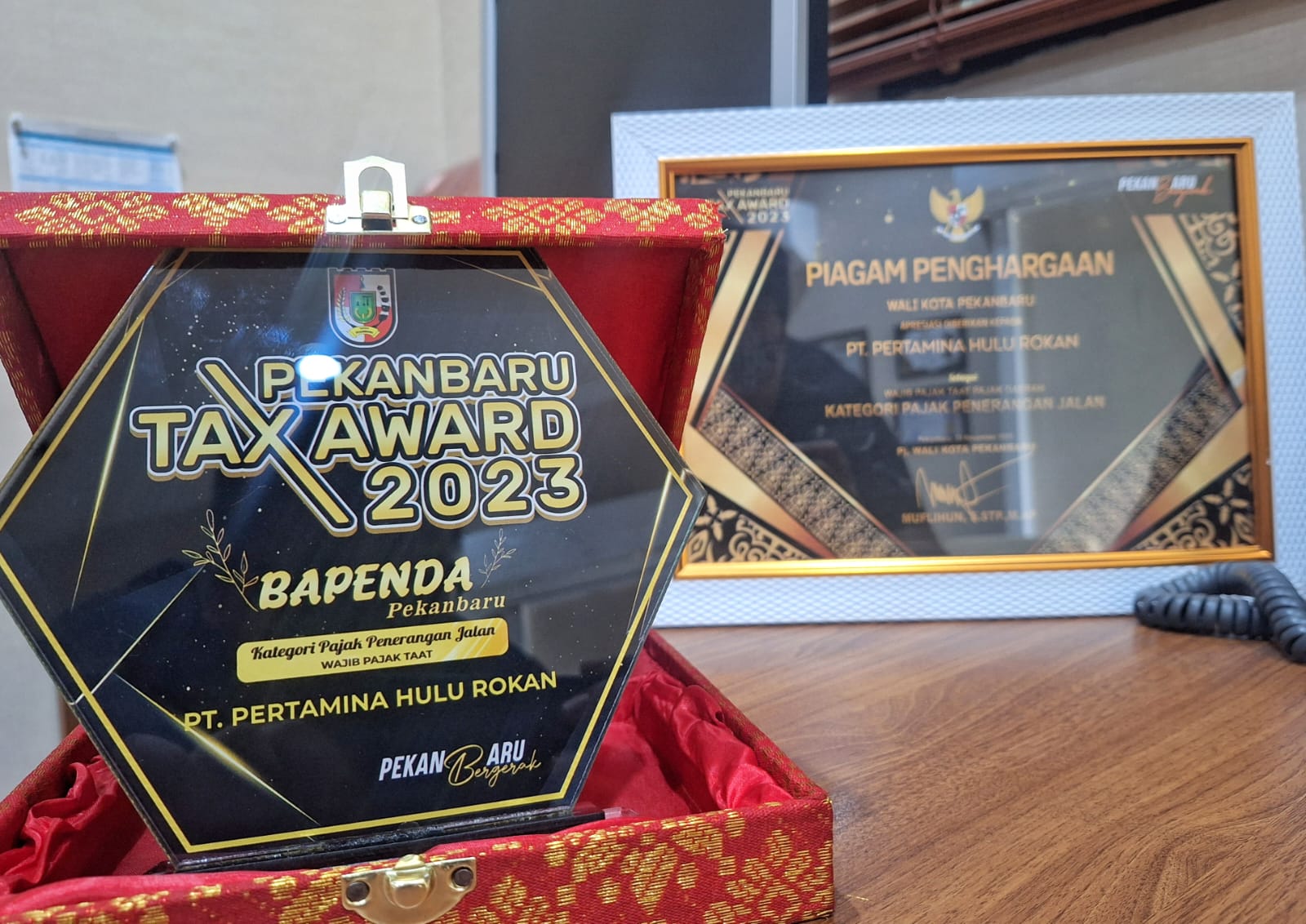 PEKANBARU (Riauinfo) — PT Pertamina Hulu Rokan (PHR) WK Rokan meraih penghargaan Pekanbaru Tax Award 2023 atas kontribusinya terhadap kepatuhan membayar pajak daerah. PHR meraih penobatan taat pajak daerah kategori Pajak Penerangan Jalan, yang diserahkan langsung oleh Pj Walikota Pekanbaru, Muflihun S.STP M.AP, di Pekanbaru, Kamis (23/11/2023).